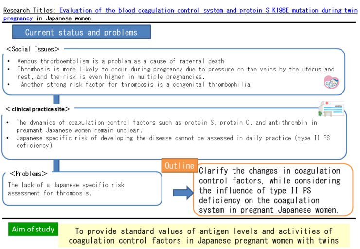 Recently, venous thromboembolism has become a problem as a cause of perinatal maternal death. Thrombosis is more likely to occur during pregnancy due to pressure on the veins by the uterus and rest, and the risk is even higher in multiple pregnancies. It is also known that during pregnancy, the coagulation control system is suppressed and the risk of thrombosis is enhanced by elevated estrogen. However, the dynamics of coagulation control factors such as protein S, protein C, and antithrombin in pregnant Japanese women remain unclear. Another strong risk factor for thrombosis is congenital thrombophilia. Among these, type II PS deficiency, which is caused by genetic polymorphisms of the PS gene, such as PS Tokushima (K196E). The K196E polymorphism is unique to the Japanese population and is reported to occur in about 1 in 55 people. In this study, we will clarify the changes in antigen levels and activities of coagulation control factors, while considering the influence of type II PS deficiency on the coagulation system in pregnant Japanese women. The National Center for Child Health and Development has a wealth of experience in delivery management, and the National Cerebral and Cardiovascular Center has a wealth of experience in basic research. The cooperation of these two facilities will make this research possible.