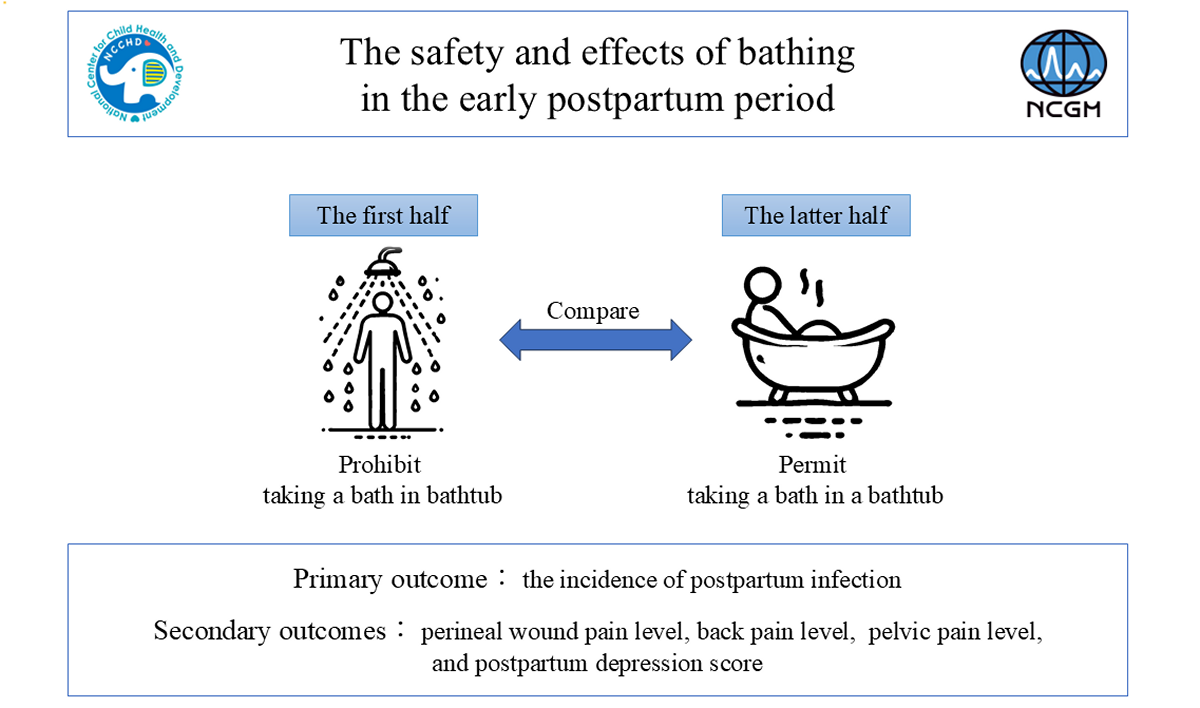 In Japan, women after vaginal delivery are generally restricted from taking baths in bathtubs in their early postpartum period. Although such restriction aimed to prevent postpartum infection, evidence was poorly established. Besides, taking sitz baths at postpartum period have been generally accepted with available evidence in several countries. The sitz baths involves bathing only the lower half of the body or the perineum and buttocks in hot or cold water. Studies have showed that this method contribute relieving pain without the risk of infection by promote blood flow to the perineum and pelvic area. Thus we made a hypothesis that bathing in a bathtub in the postpartum period is safe and beneficial as well.